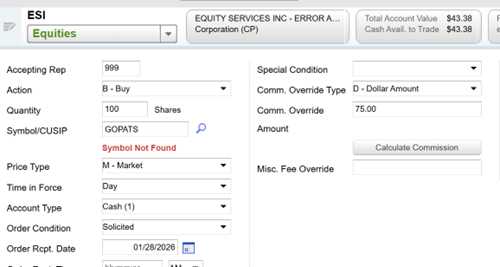 • Registered Representatives must manually input a commission override at the time of trade entry