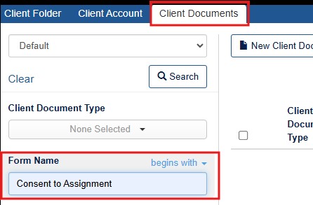 - Go to Client Documents → Form Name “Consent to Assignment” → Search