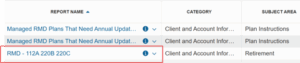 (Menu → Retirement and Planning → Retirement Hub). Once in the Retirement Hub, click on the RMD hyperlink to view your client data and monitor who’s already scored and who’s still in the red zone.