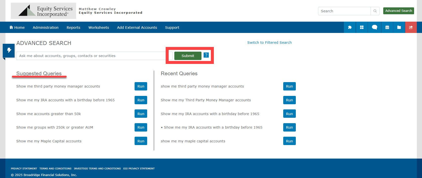 Once on the Advanced Search page you can run one of the Suggested Queries or build a query of your own by entering search terms in the box at the top of the page and clicking the green Submit button.