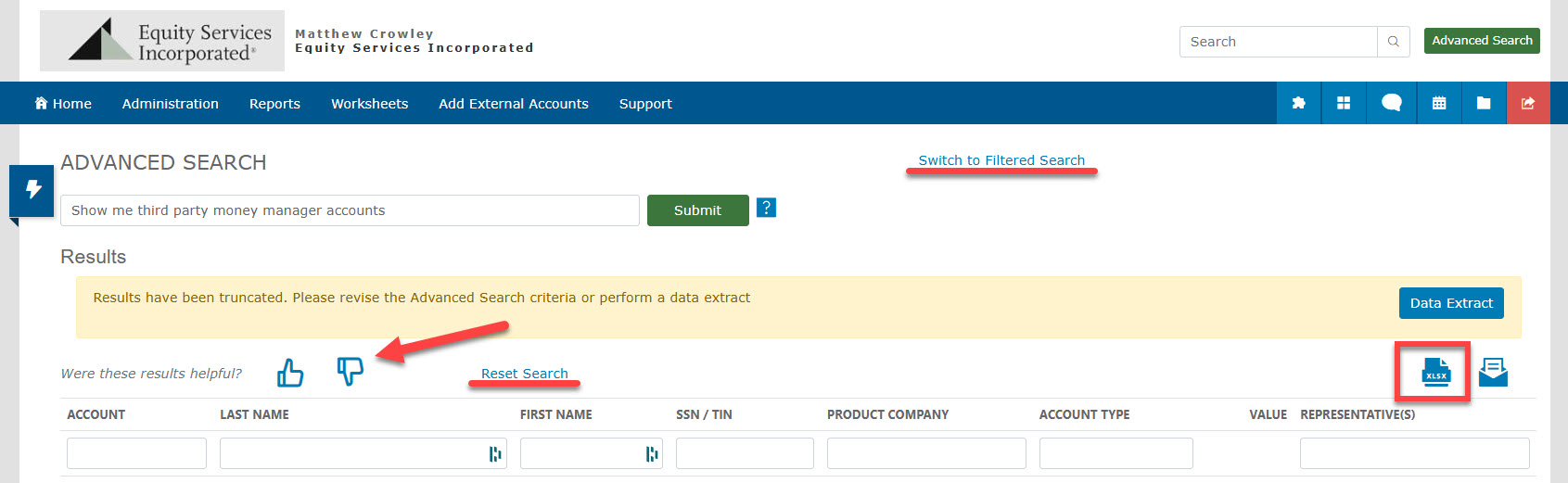 Results of your query will display as shown below. You can view the results, export them for further analysis, reset the search or even switch back to a filtered search.