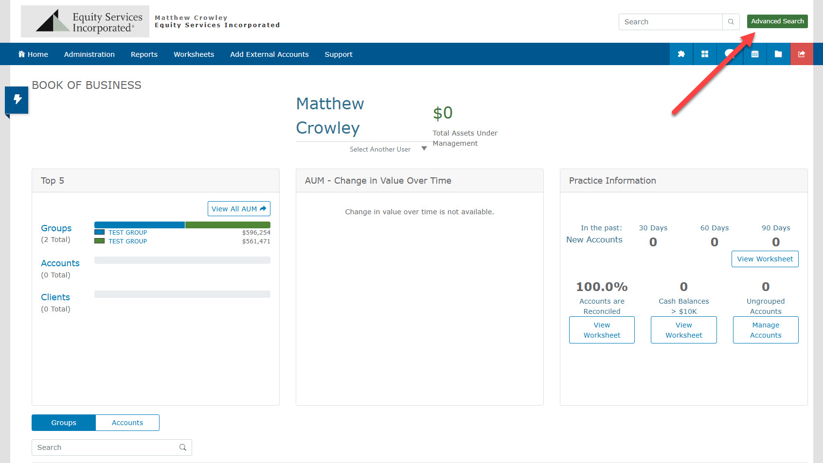You can access the AI-powered search tool via the Advanced Search page. Click on the green Advanced Search button in the top right corner of your Book of Business page as shown below.